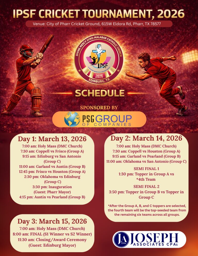 Hosted by Divine Mercy Syro Malabar Catholic Church in collaboration with the City of Edinburg, Texas, IPSF 2026 will be held from August 6–9, 2026, bringing together ten vibrant Syro Malabar parishes from the Texas–Oklahoma region under the Diocese of Chicago.